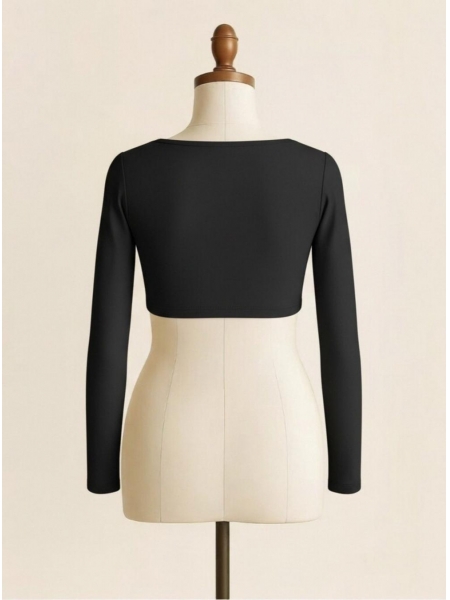 Refined simplicity at its finest — this sleek black crop top proves that less is always more. The structured square neckline frames the collarbone and décolletage with a clean, geometric elegance that effortlessly blurs the line between activewear and everyday fashion. Full-length slim sleeves extend the sophisticated silhouette while providing extra coverage and warmth, making it a versatile layering essential across seasons. The cropped hemline sits at the natural waist, pairing perfectly with high-waisted leggings, joggers, or skirts. Crafted from a smooth, compressive fabric with a subtle matte finish, it sculpts and supports without sacrificing comfort or breathability. From Pilates mornings to evening outings, this understated yet striking top is a wardrobe staple you'll reach for again and again.