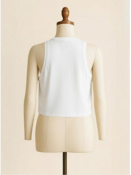 Sometimes the most powerful statement is pure simplicity. This crisp white crop tank strips activewear back to its purest form — clean lines, a relaxed boxy silhouette, and an easy crew neckline that sits comfortably without gaping or pulling. Wide, structured armholes allow complete freedom of movement while maintaining a modest, polished coverage that works equally well in and out of the gym. A delicate tonal embroidered logo at the chest offers the only hint of branding, keeping the overall aesthetic refreshingly understated. The slightly oversized, straight-cut crop hem hits just above the waistband, making it an effortless match for leggings, biker shorts, or high-waisted trousers. Breathable, lightweight, and infinitely versatile — the white crop tank every wardrobe quietly needs.
