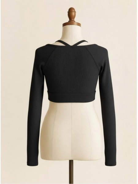 Meet your new favorite workout-to-street essential. This innovative two-piece set combines a ribbed sports bra with a sleek long-sleeve bolero shrug, creating a striking cold-shoulder layered look that's as functional as it is stylish. The inner ribbed bra offers light support with thin adjustable straps and a wide elastic underband, keeping you secure through every move. The outer long-sleeve layer adds arm coverage and a fashion-forward edge, perfect for yoga, pilates, or studio sessions. Crafted from smooth, stretchy performance fabric, it delivers a second-skin fit with superior breathability. The all-black colorway and minimalist branding keep the aesthetic clean and modern. Wear it to the gym, pair it with high-waisted leggings for class, or style it under a blazer for an athleisure-chic vibe that takes you beyond the studio.