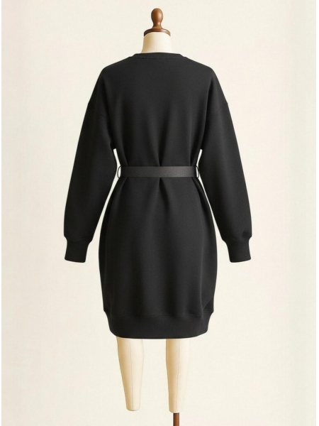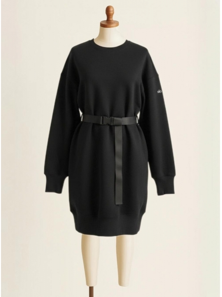 Cozy meets cool in the Midnight Belted Oversized Sweatshirt Dress — a laid-back mini dress that brings serious style energy. Cut from plush, heavyweight fleece in an all-black palette, the relaxed oversized silhouette features a classic crew neckline, dropped shoulders, and ribbed cuffs and hem for a polished finish. The defining detail is a sleek tactical buckle belt at the waist, cinching the voluminous shape into an effortlessly chic, street-ready look. A tonal sleeve logo adds a subtle branded touch. Wear it solo with sneakers or layer over leggings for cooler days — endlessly versatile, undeniably bold.